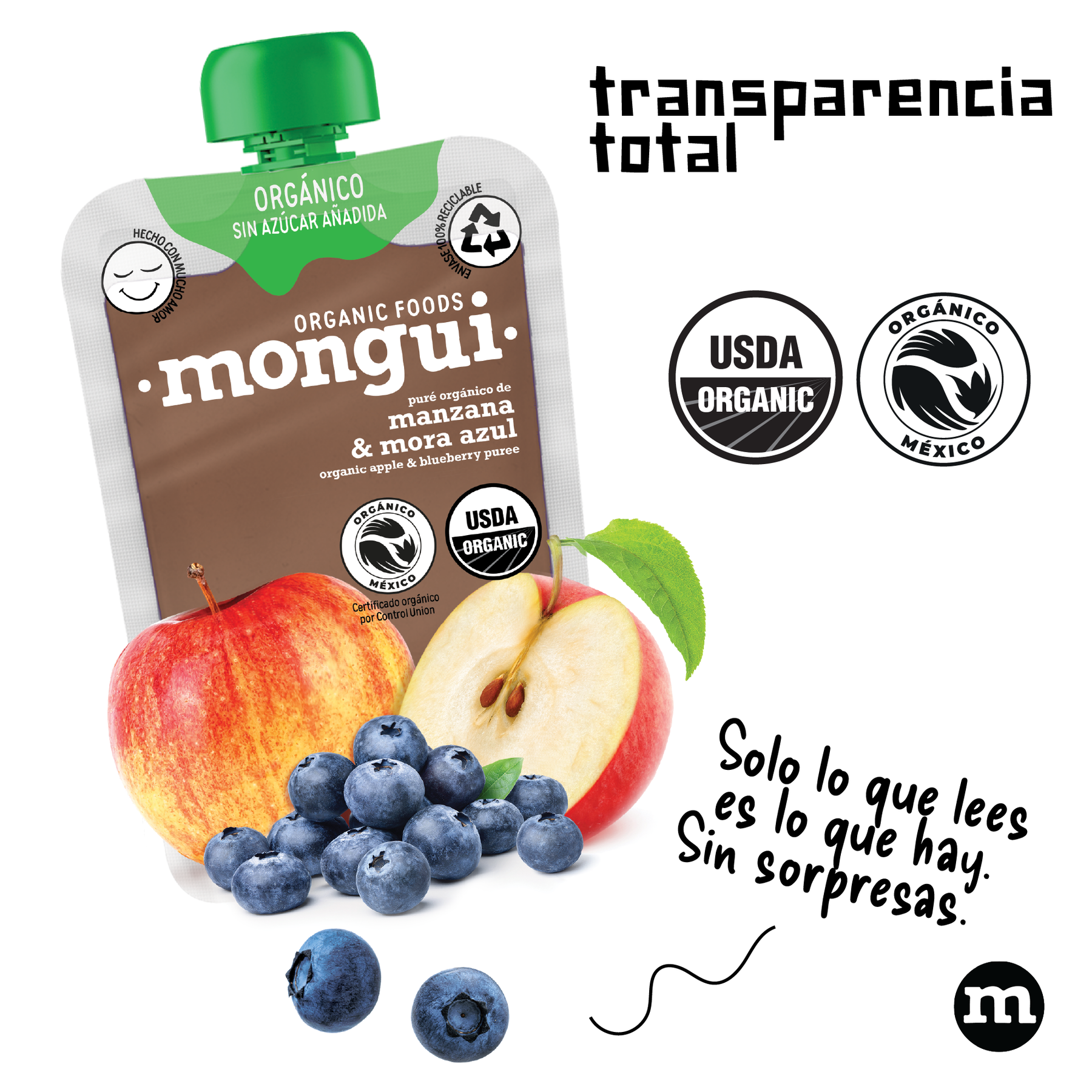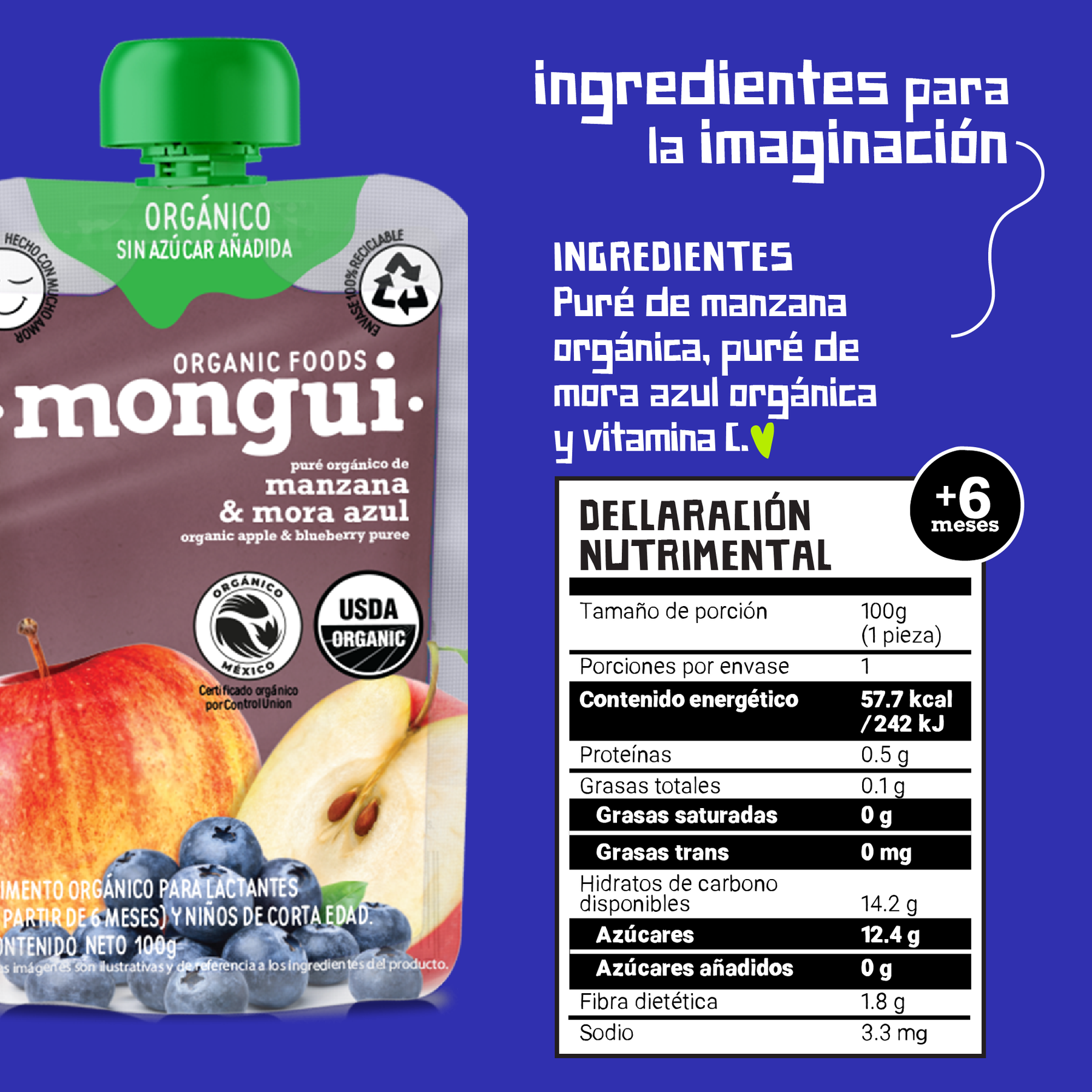 INGREDIENTES MANZANA MORA AZUL: Puré de manzana orgánica, puré de mora azul orgánica y vitamina C.